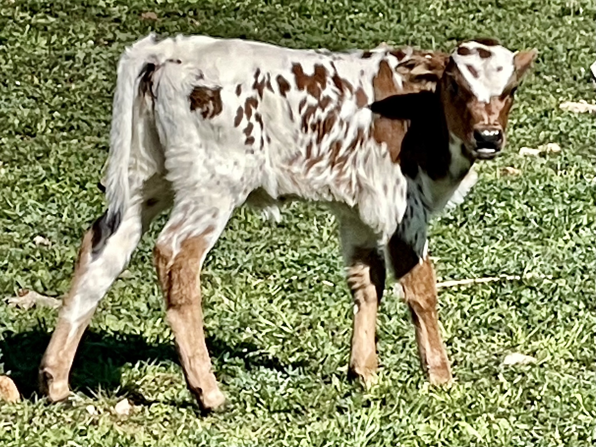Parker brown head with white shield, parker brown neck and shoulders. White body with parker brown spots. Black nose, toes, and tail tip.