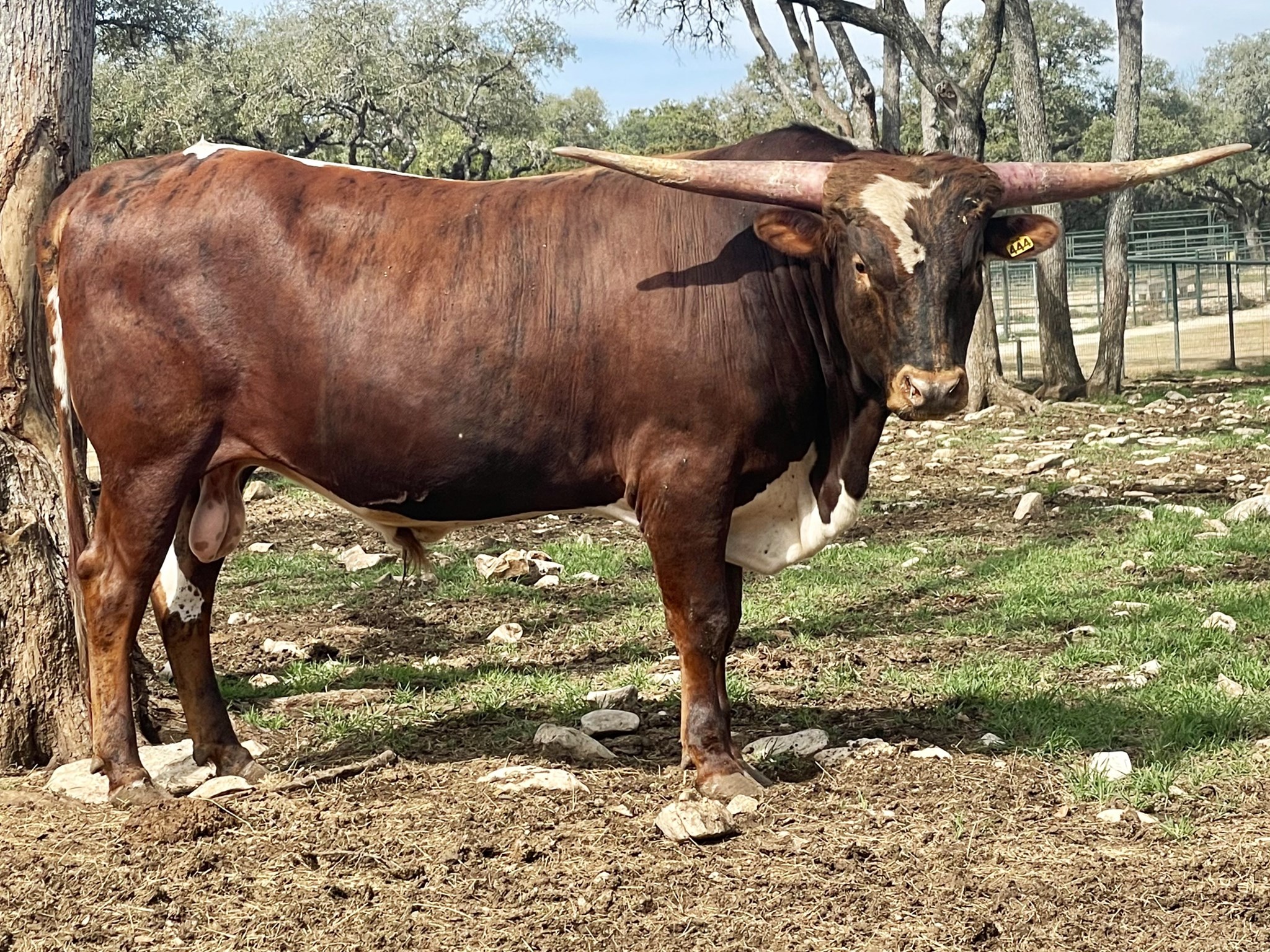 SR 444 is a nice young bull with great brindle and white coloring, good conformation, and really nice lateral horn growth. His pedigree is full of JP Rio Grande and Jamakizm so he would be perfect for a breeder who is looking to introduce those bloodlines into a herd.