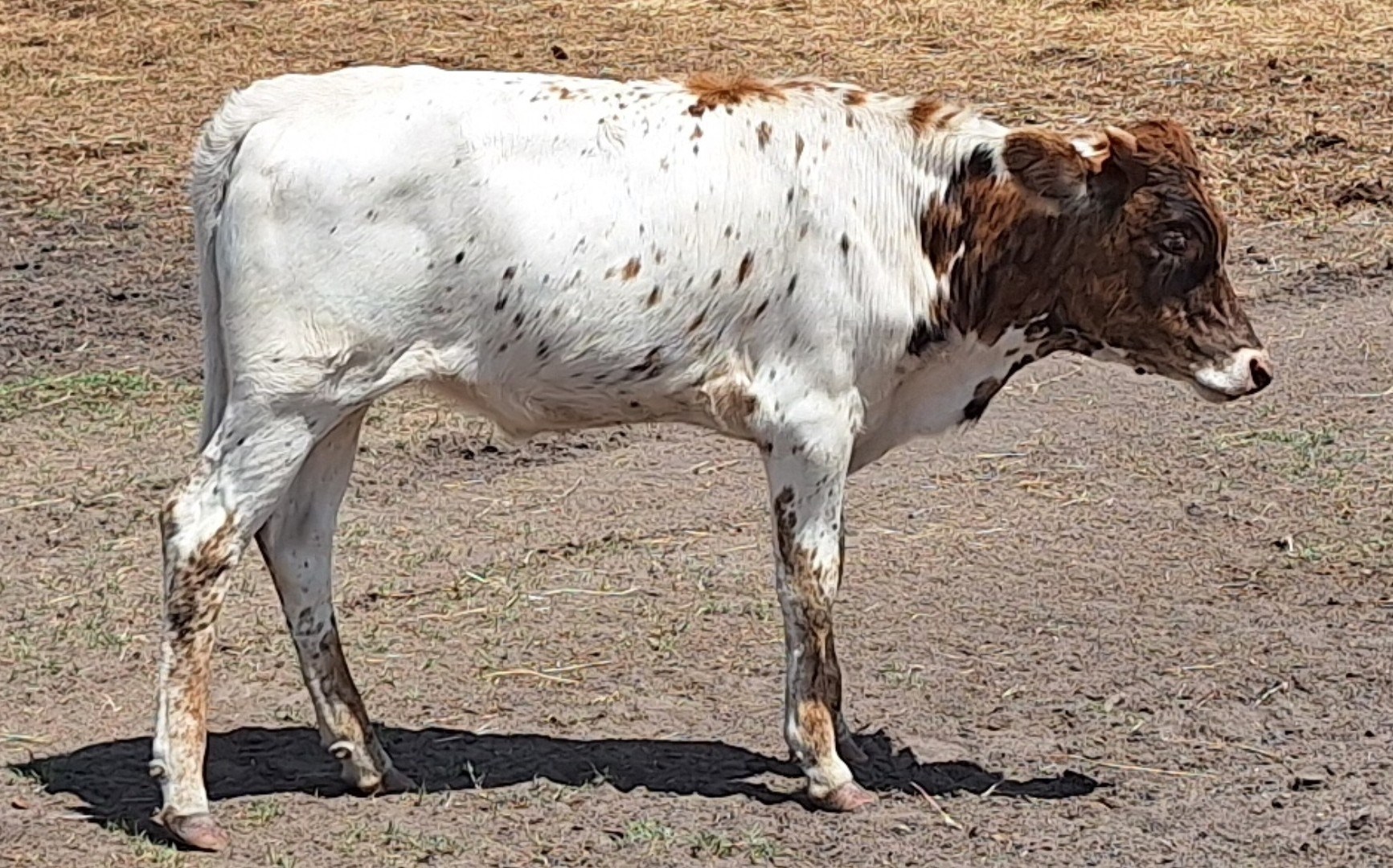 White, brindle nose and head Light confetti speckles on body, heavy on legs.